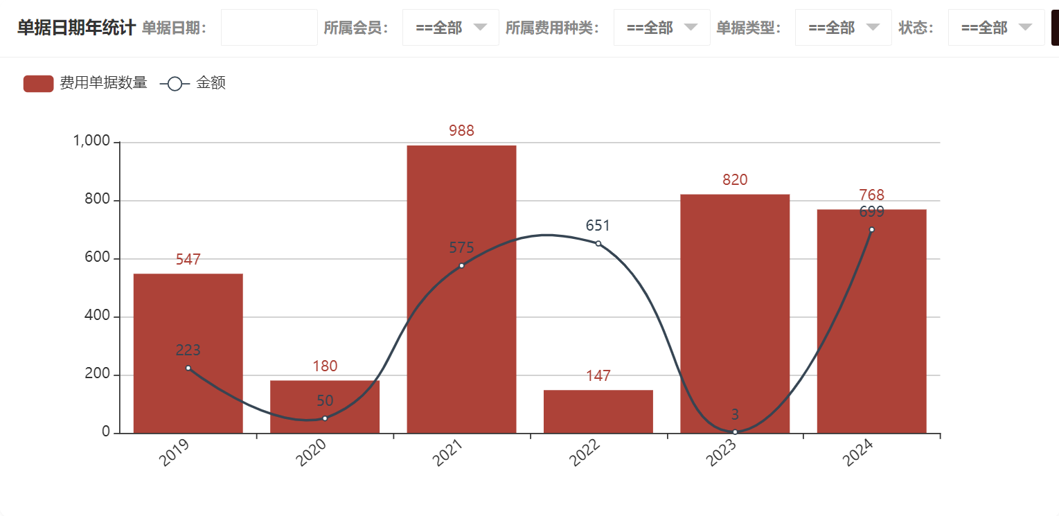 在费用单据统计中可以看到所属会员统计、所属费用种类统计、单据日期年统计、单据日期月统计、单据日期日统计、单据类型统计、状态统计,单据日期年统计如图所示: