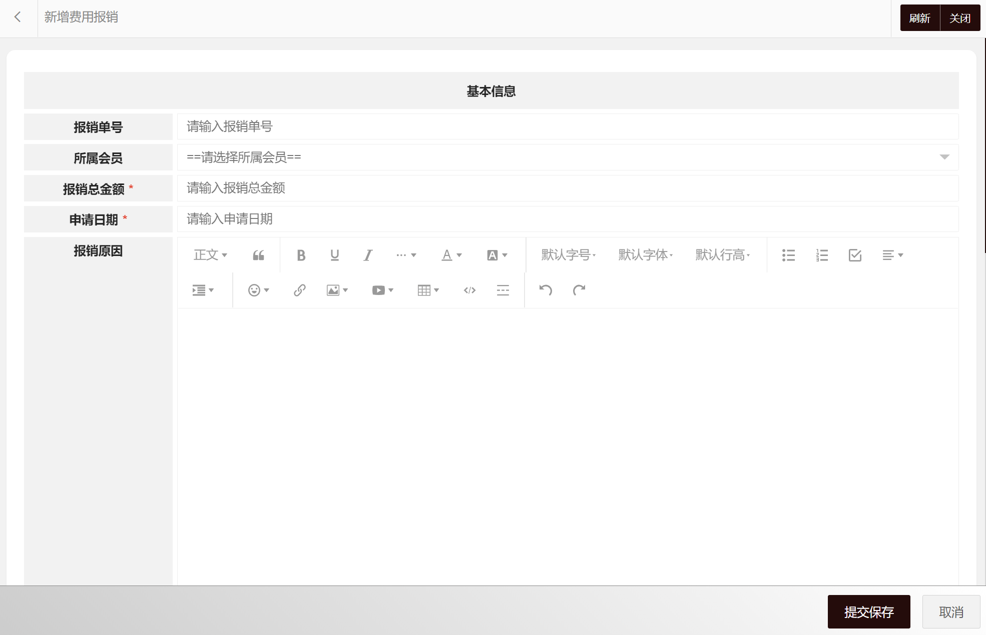 在费用报销列表中可以选择新增费用报销、编辑费用报销、删除费用报销、搜索费用报销等。费用报销属性包括:费用报销编码、报销单号、所属会员、报销总金额、申请日期、报销原因、报销状态、所属当前审批人、审批时间、拒绝原因、所属创建会员、所属更新会员等。新增费用报销界面如图所示: