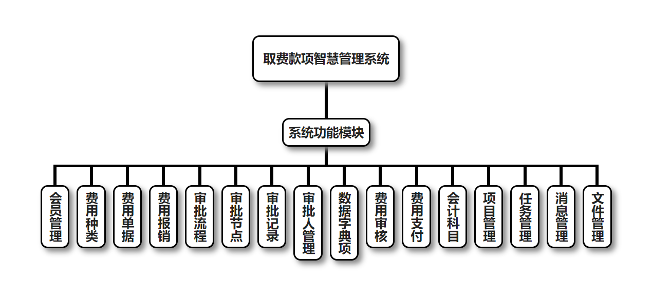 取费款项智慧管理系统的主要功能包括:会员管理、费用种类管理、费用单据管理、费用报销管理、审批流程管理、审批节点管理、审批记录管理、审批人管理、数据字典项管理、费用审核管理、费用支付管理、会计科目管理、项目管理、任务管理、消息管理、文件管理。
