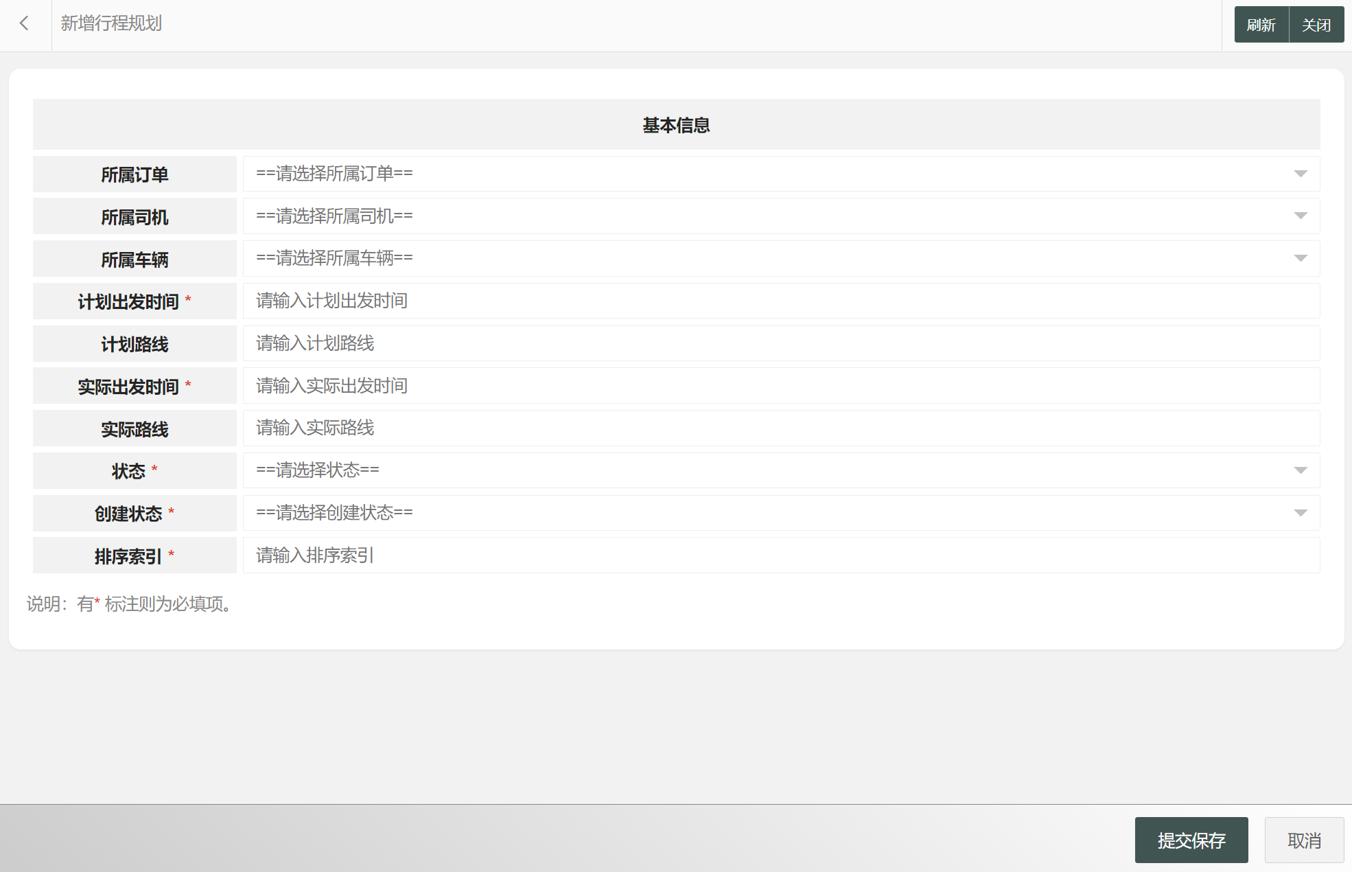 在行程规划列表中可以选择新增行程规划、编辑行程规划、删除行程规划、搜索行程规划等。行程规划属性包括:行程规划编码、所属订单、所属司机、所属车辆、计划出发时间、计划路线、实际出发时间、实际路线、状态等。新增行程规划界面如图所示: