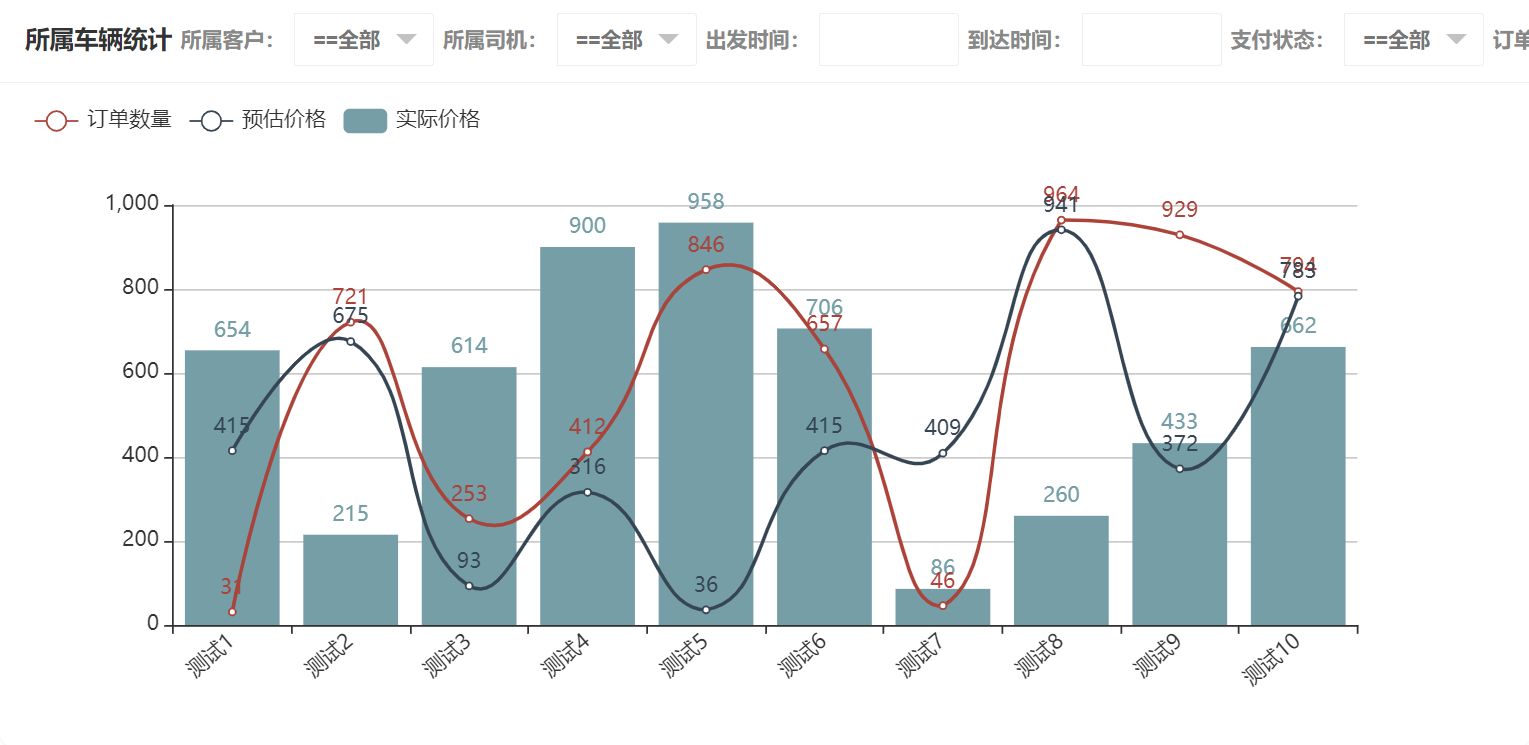 在订单统计中可以看到所属客户统计、所属司机统计、所属车辆统计、出发时间年统计、出发时间月统计、出发时间日统计、到达时间年统计、到达时间月统计、到达时间日统计、支付状态统计、订单状态统计,所属车辆统计如图所示: