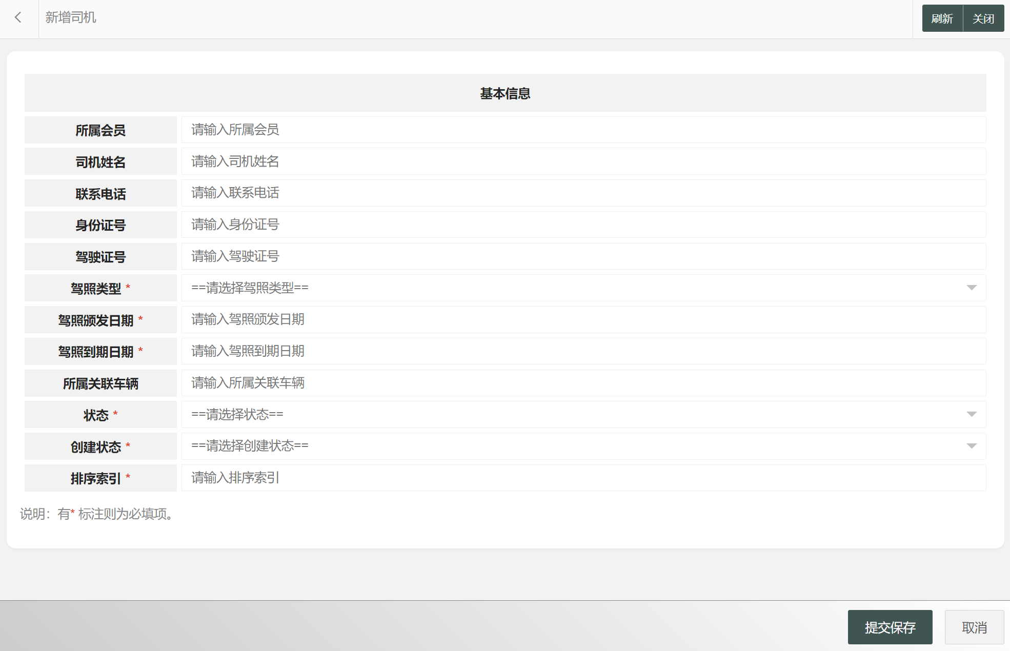 在司机列表中可以选择新增司机、编辑司机、删除司机、搜索司机等。司机属性包括:司机编码、所属会员、司机姓名、联系电话、身份证号、驾驶证号、驾照类型、驾照颁发日期、驾照到期日期、所属关联车辆、状态等。新增司机界面如图所示: