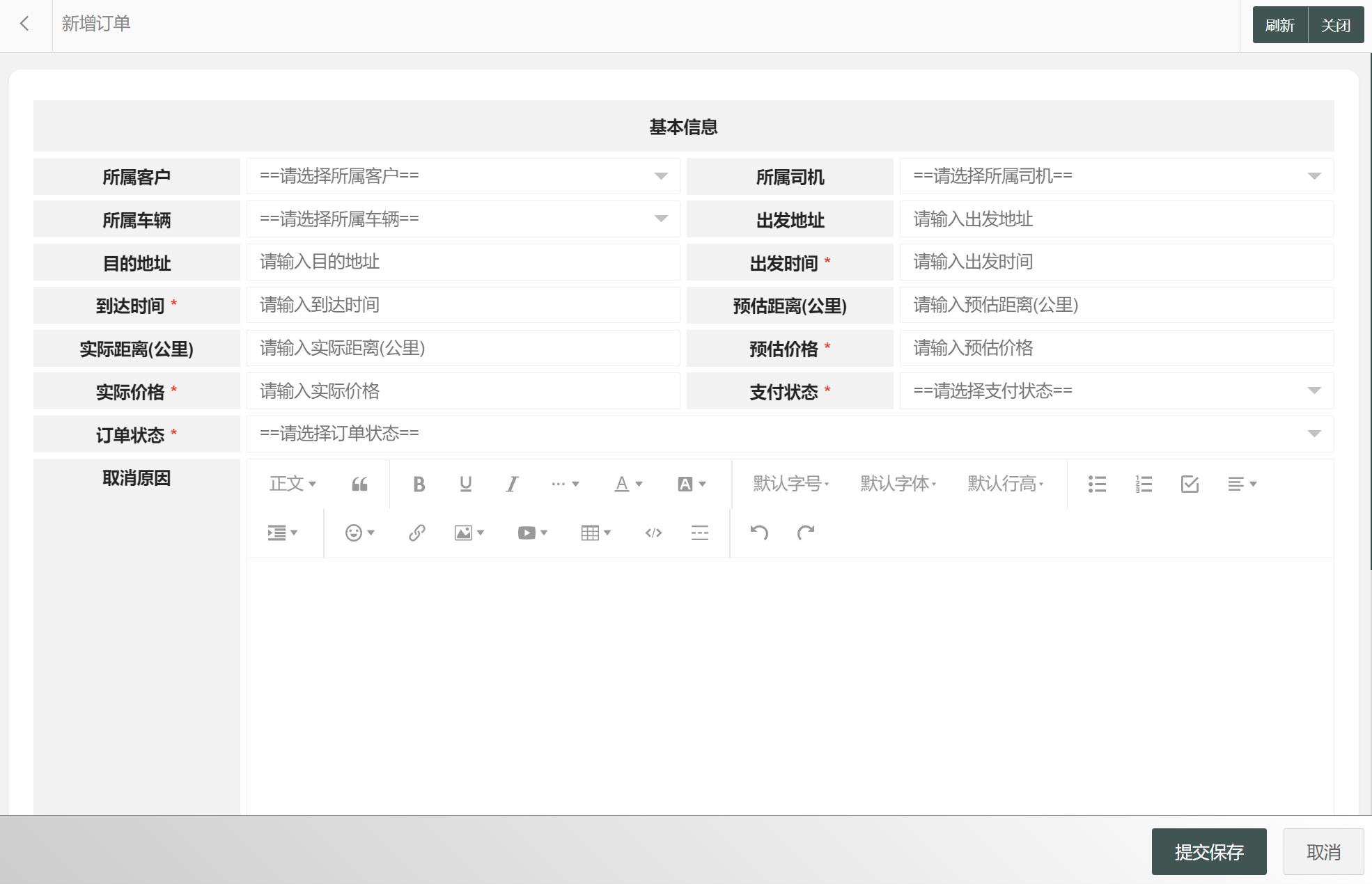 在订单列表中可以选择新增订单、编辑订单、删除订单、搜索订单等。订单属性包括:订单编码、所属客户、所属司机、所属车辆、出发地址、目的地址、出发时间、到达时间、预估距离(公里)、实际距离(公里)、预估价格、实际价格、支付状态、订单状态、取消原因等。新增订单界面如图所示: