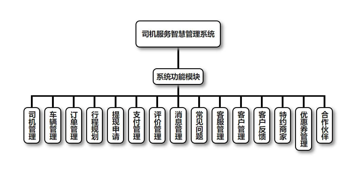 司机服务智慧管理系统的主要功能包括:司机管理、车辆管理、订单管理、行程规划管理、提现申请管理、支付管理、评价管理、消息管理、常见问题管理、客服管理、客户管理、客户反馈管理、特约商家管理、优惠券管理、合作伙伴管理。
