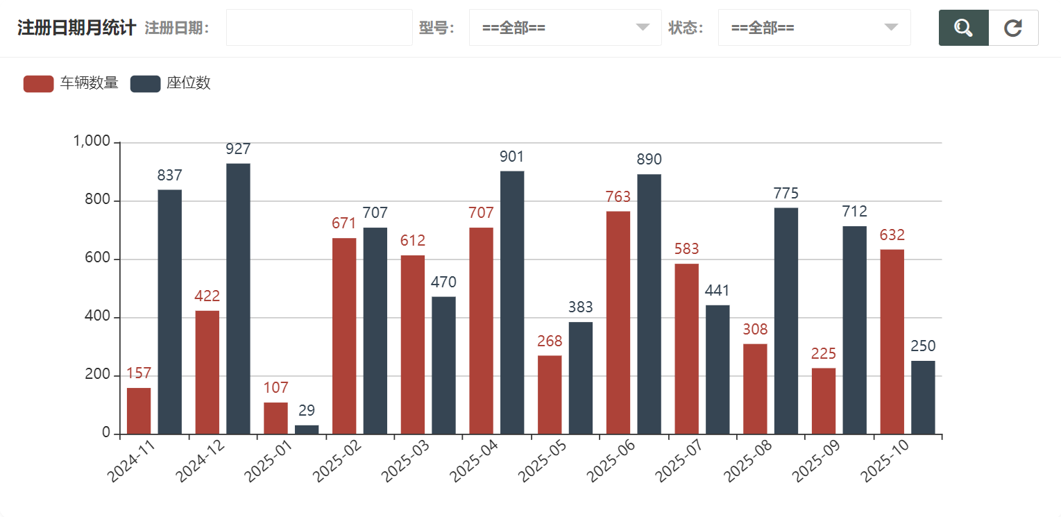 在车辆统计中可以看到型号统计、注册日期年统计、注册日期月统计、注册日期日统计、年检日期年统计、年检日期月统计、年检日期日统计、保险到期日期年统计、保险到期日期月统计、保险到期日期日统计、状态统计,注册日期月统计如图所示: