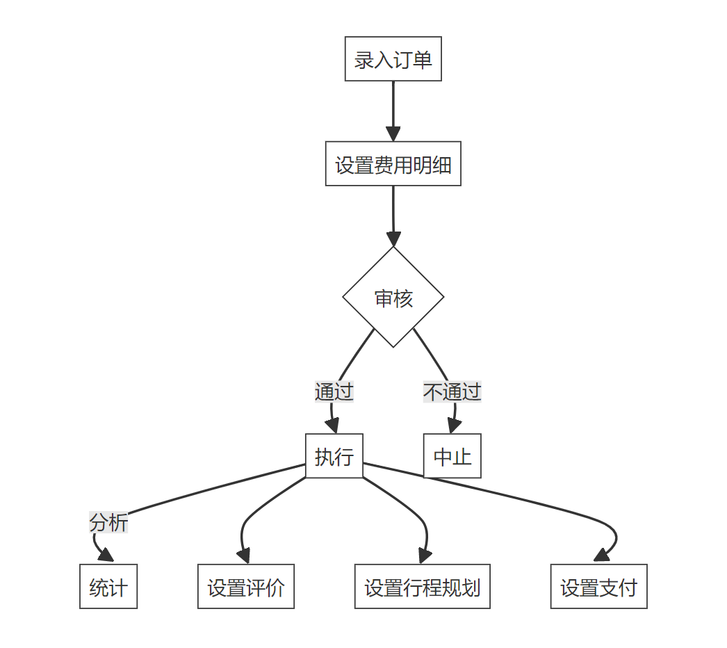 在订单管理中,主要角色包括普通员工和部门领导。普通员工负责数据录入、查阅执行及信息变更等操作;部门领导则承担数据审核与统计分析的任务。具体用例如下:1) 普通员工创建新订单时需填写客户、司机、车辆相关信息,并指定出发地址、目的地址,输入预计时间和距离,计算预估价格并提交;2) 系统自动分配司机和车辆给普通员工所创建的订单;3) 部门领导审核后确认或驳回订单;4) 普通员工更新实际行驶信息如到达时间、里程数及费用,并记录支付状态与订单最终状态。