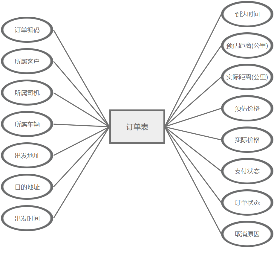 订单管理主要属性包括:订单编码、所属客户、所属司机、所属车辆、出发地址、目的地址、出发时间、到达时间、预估距离(公里)、实际距离(公里)、预估价格、实际价格、支付状态、订单状态、取消原因。