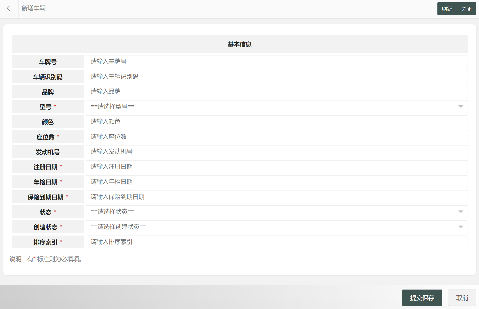 在车辆列表中可以选择新增车辆、编辑车辆、删除车辆、搜索车辆等。车辆属性包括:车辆编码、车牌号、车辆识别码、品牌、型号、颜色、座位数、发动机号、注册日期、年检日期、保险到期日期、状态等。新增车辆界面如图所示: