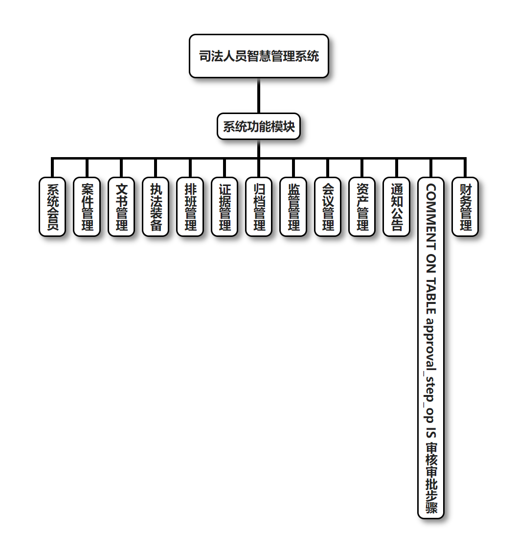 司法人员智慧管理系统的主要功能包括:系统会员管理、案件管理、文书管理、执法装备管理、排班管理、证据管理、归档管理、监管管理、会议管理、资产管理、通知公告管理、COMMENT ON TABLE approval_step_op IS 审核审批步骤管理、财务管理。