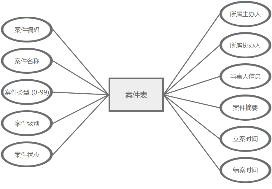 案件管理主要属性包括:案件编码、案件名称、案件类型 (0-99)、案件级别、案件状态、所属主办人、所属协办人、当事人信息、案件摘要、立案时间、结案时间。