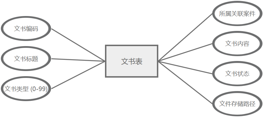 文书管理主要属性包括:文书编码、文书标题、文书类型 (0-99)、所属关联案件、文书内容、文书状态、文件存储路径。