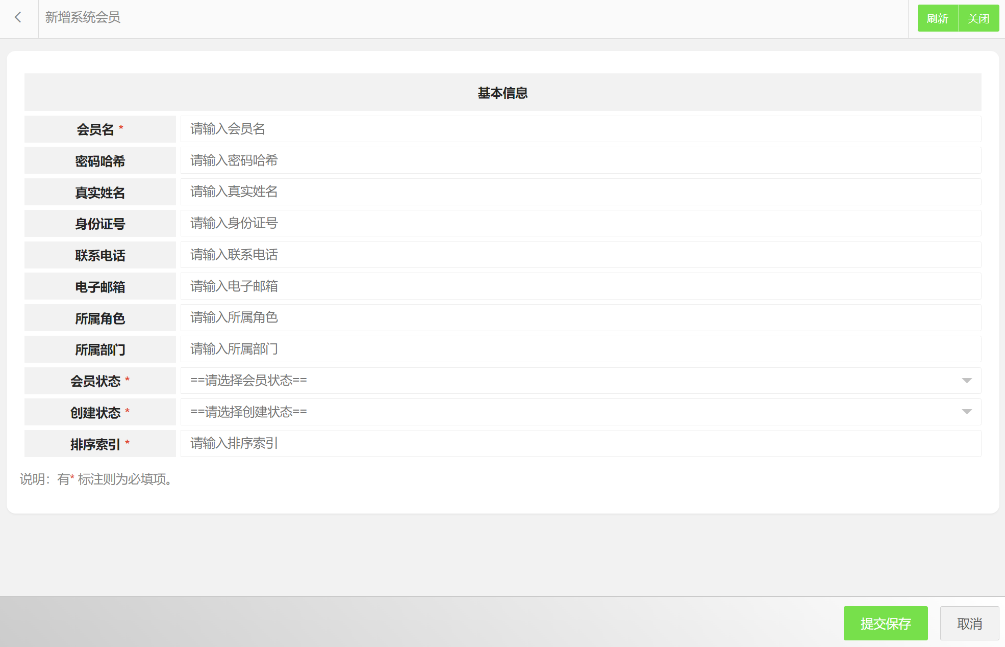 在系统会员列表中可以选择新增系统会员、编辑系统会员、删除系统会员、搜索系统会员等。系统会员属性包括:系统会员编码、会员名、密码哈希、真实姓名、身份证号、联系电话、电子邮箱、所属角色、所属部门、会员状态等。新增系统会员界面如图所示: