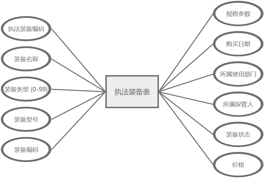 执法装备管理主要属性包括:执法装备编码、装备名称、装备类型 (0-99)、装备型号、装备编码、规格参数、购买日期、所属使用部门、所属保管人、装备状态、价格。