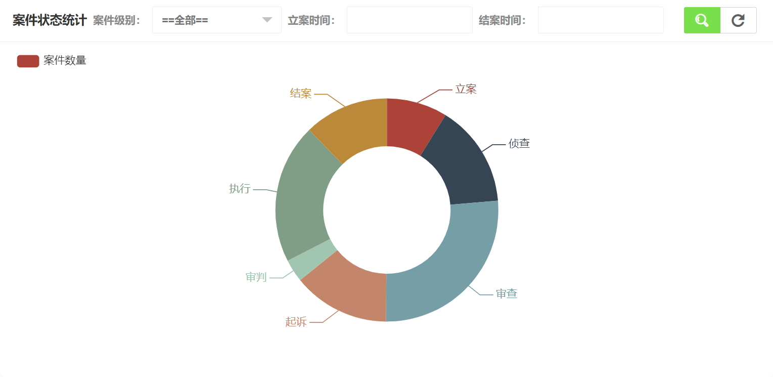 在案件统计中可以看到案件级别统计、案件状态统计、立案时间年统计、立案时间月统计、立案时间日统计、结案时间年统计、结案时间月统计、结案时间日统计,案件状态统计如图所示: