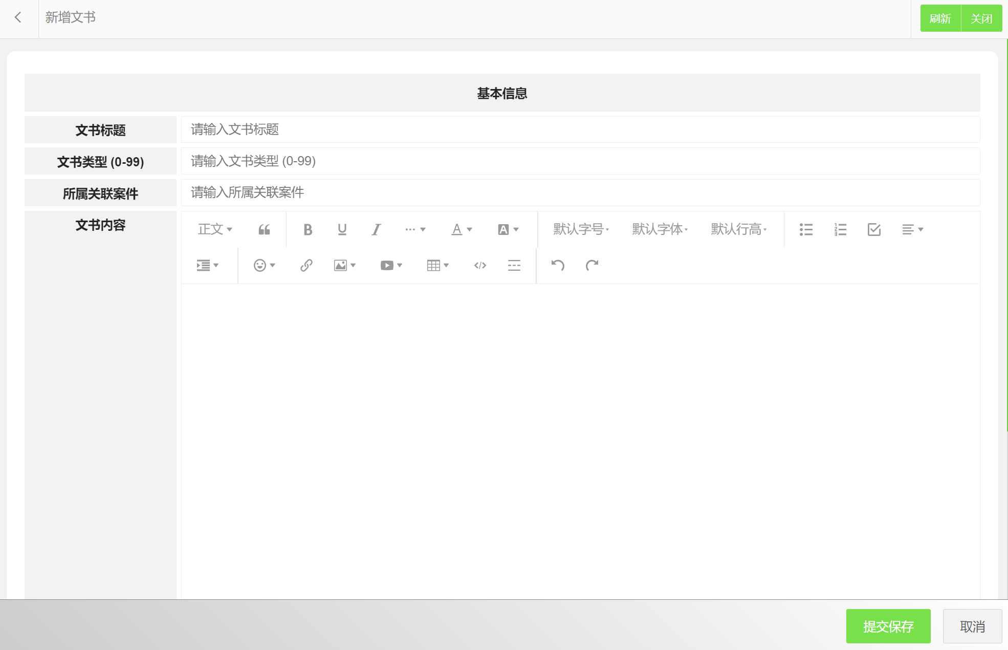在文书列表中可以选择新增文书、编辑文书、删除文书、搜索文书等。文书属性包括:文书编码、文书标题、文书类型 (0-99)、所属关联案件、文书内容、文书状态、文件存储路径等。新增文书界面如图所示: