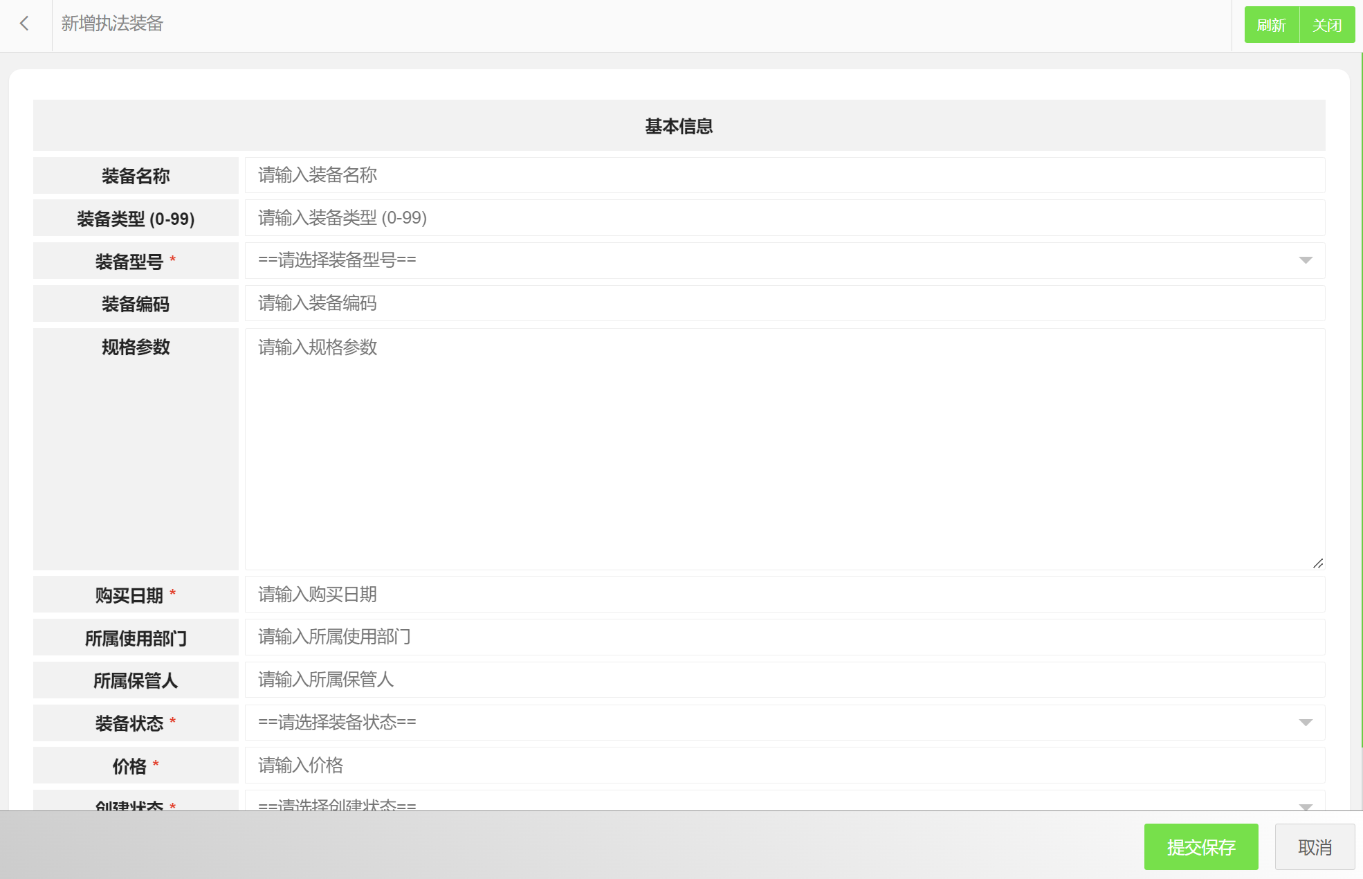 在执法装备列表中可以选择新增执法装备、编辑执法装备、删除执法装备、搜索执法装备等。执法装备属性包括:执法装备编码、装备名称、装备类型 (0-99)、装备型号、装备编码、规格参数、购买日期、所属使用部门、所属保管人、装备状态、价格等。新增执法装备界面如图所示: