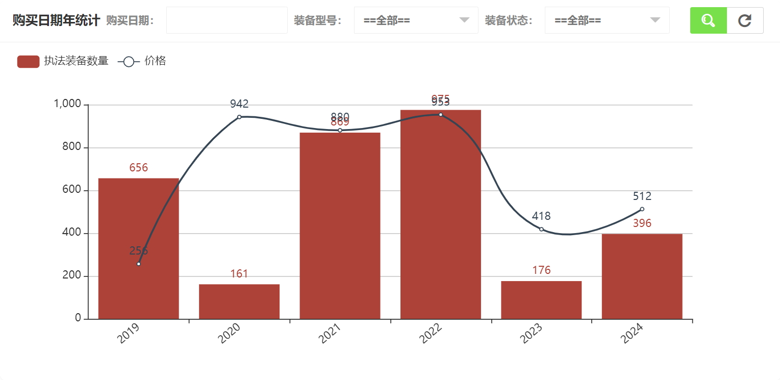 在执法装备统计中可以看到装备型号统计、购买日期年统计、购买日期月统计、购买日期日统计、装备状态统计,购买日期年统计如图所示: