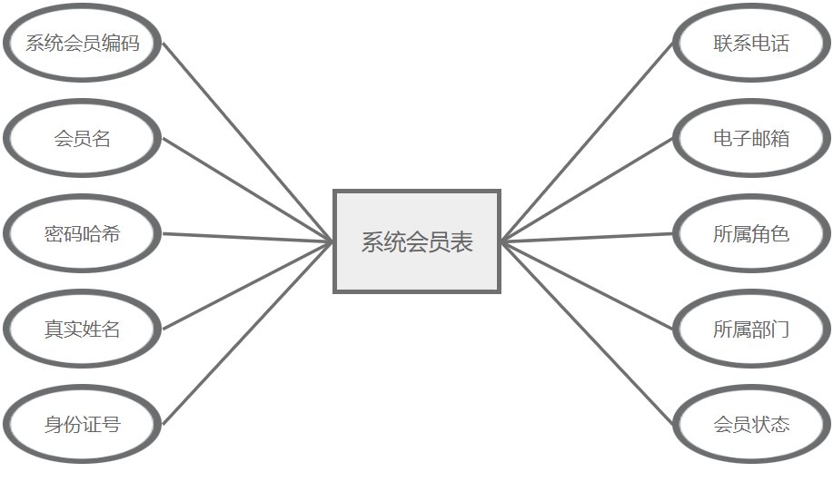 系统会员管理主要属性包括:系统会员编码、会员名、密码哈希、真实姓名、身份证号、联系电话、电子邮箱、所属角色、所属部门、会员状态。