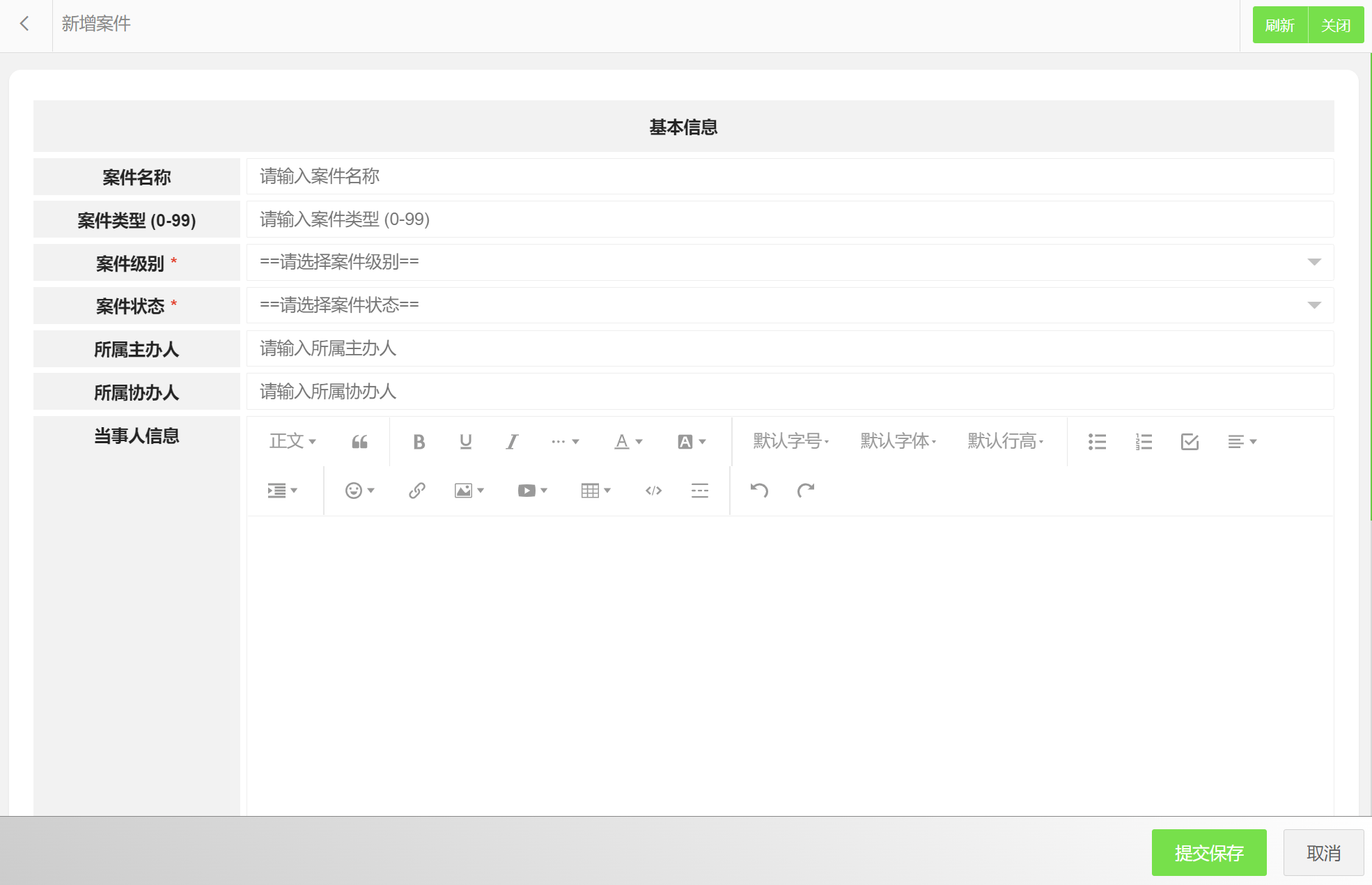 在案件列表中可以选择新增案件、编辑案件、删除案件、搜索案件等。案件属性包括:案件编码、案件名称、案件类型 (0-99)、案件级别、案件状态、所属主办人、所属协办人、当事人信息、案件摘要、立案时间、结案时间等。新增案件界面如图所示:
