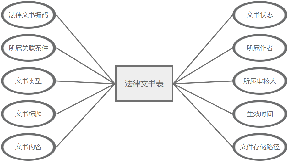 法律文书管理主要属性包括:法律文书编码、所属关联案件、文书类型、文书标题、文书内容、文书状态、所属作者、所属审核人、生效时间、文件存储路径。