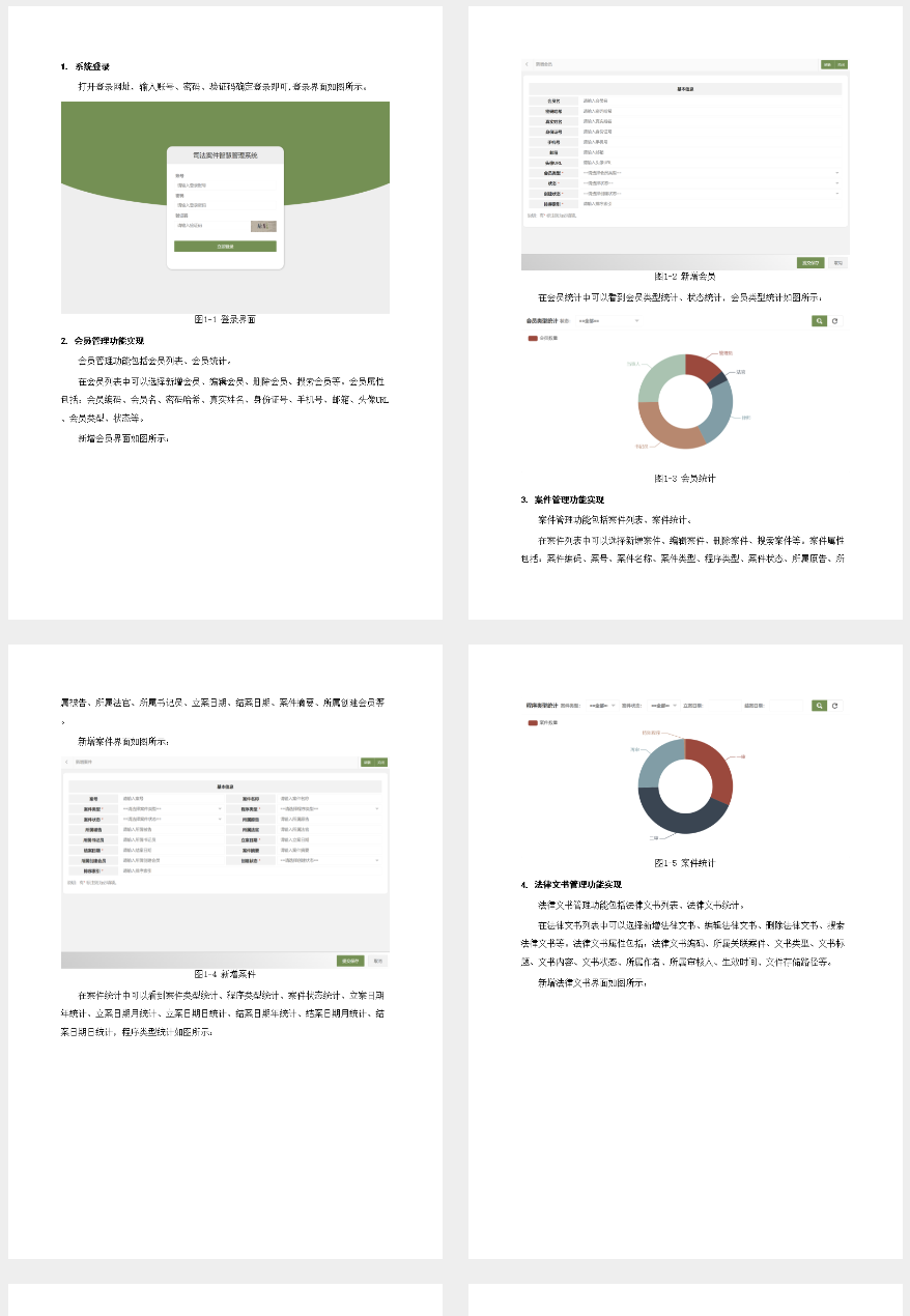 司法案件智慧管理系统主要功能包括:会员管理、案件管理、法律文书管理、应诉管理、审判管理、审查管理、调解管理、送达管理、结案管理、消息管理、文件管理、提醒管理、法律法规管理、法律知识管理、咨询管理、任务管理和排班管理。会员模块负责用户信息录入和维护;案件模块包括案件基本信息、流程跟踪及状态变更等功能;法律文书模块实现文档创建与审核,支持高效检索和归档管理。应诉与审判模块协助记录诉讼过程中的重要节点,并提供详细统计分析功能。审查与调解模块则专注于处理非正式法律纠纷解决途径的相关信息。送达模块确保所有文件准确无误地传达给相关方并跟踪签收情况;结案模块负责案件终结流程及后续执行工作,发布裁判文书和指定执行人员。消息管理模块支持内部通讯网络的构建与发展,并提供任务通知与状态更新功能。法律法规模块存储最新法律条文信息供查询使用,确保系统内容及时更新以符合实际需求变化趋势。法律知识模块用于收集整理各类专业资料便于随时查阅学习;咨询模块则连接律师和普通用户满足日常咨询服务要求。任务管理模块帮助规划工作进度并跟踪完成情况;排班管理模块支持合理安排人员加班与休息时间,提高工作效率的同时保障员工身心健康。