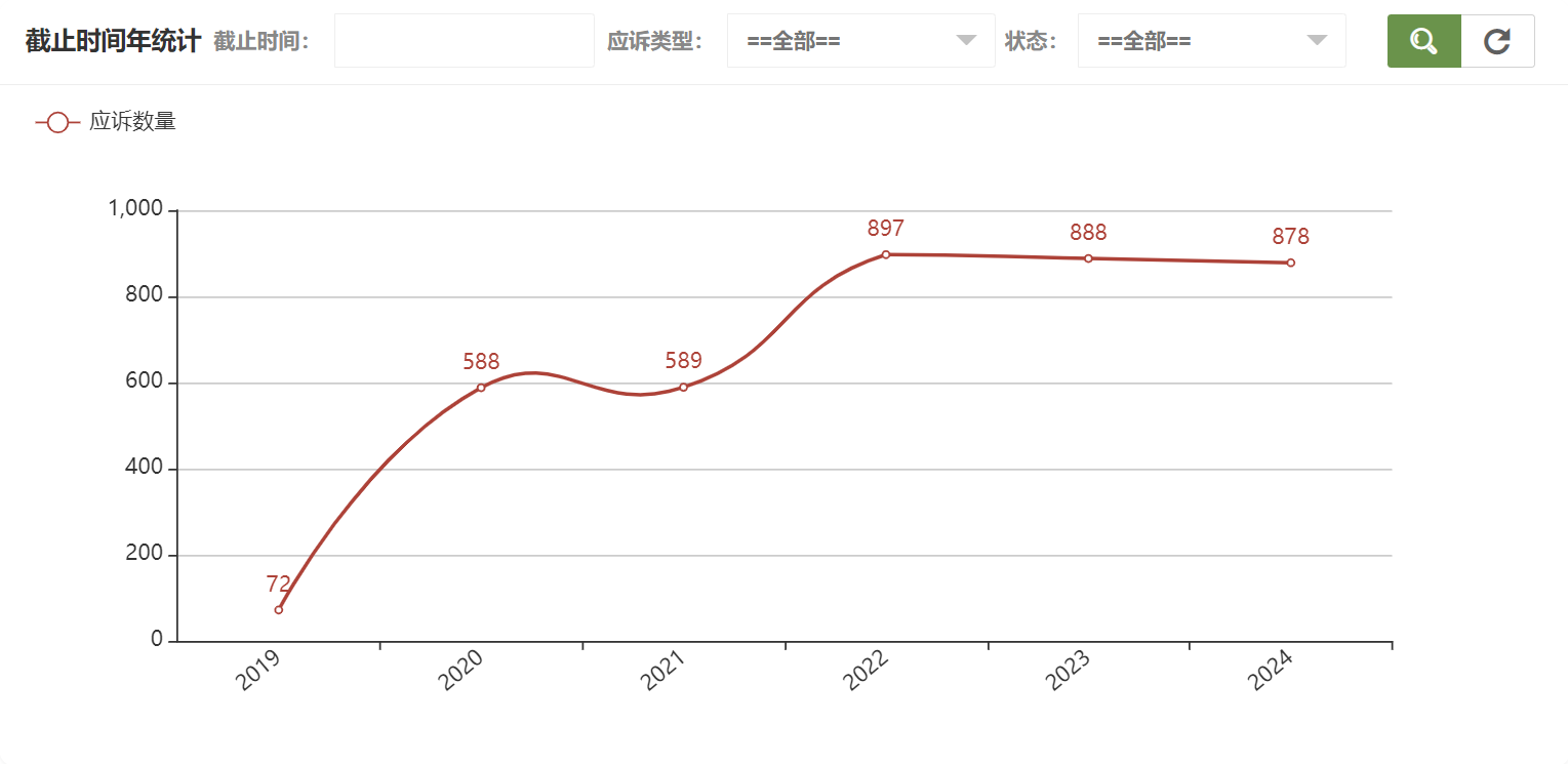 在应诉统计中可以看到应诉类型统计、状态统计、截止时间年统计、截止时间月统计、截止时间日统计,截止时间年统计如图所示: