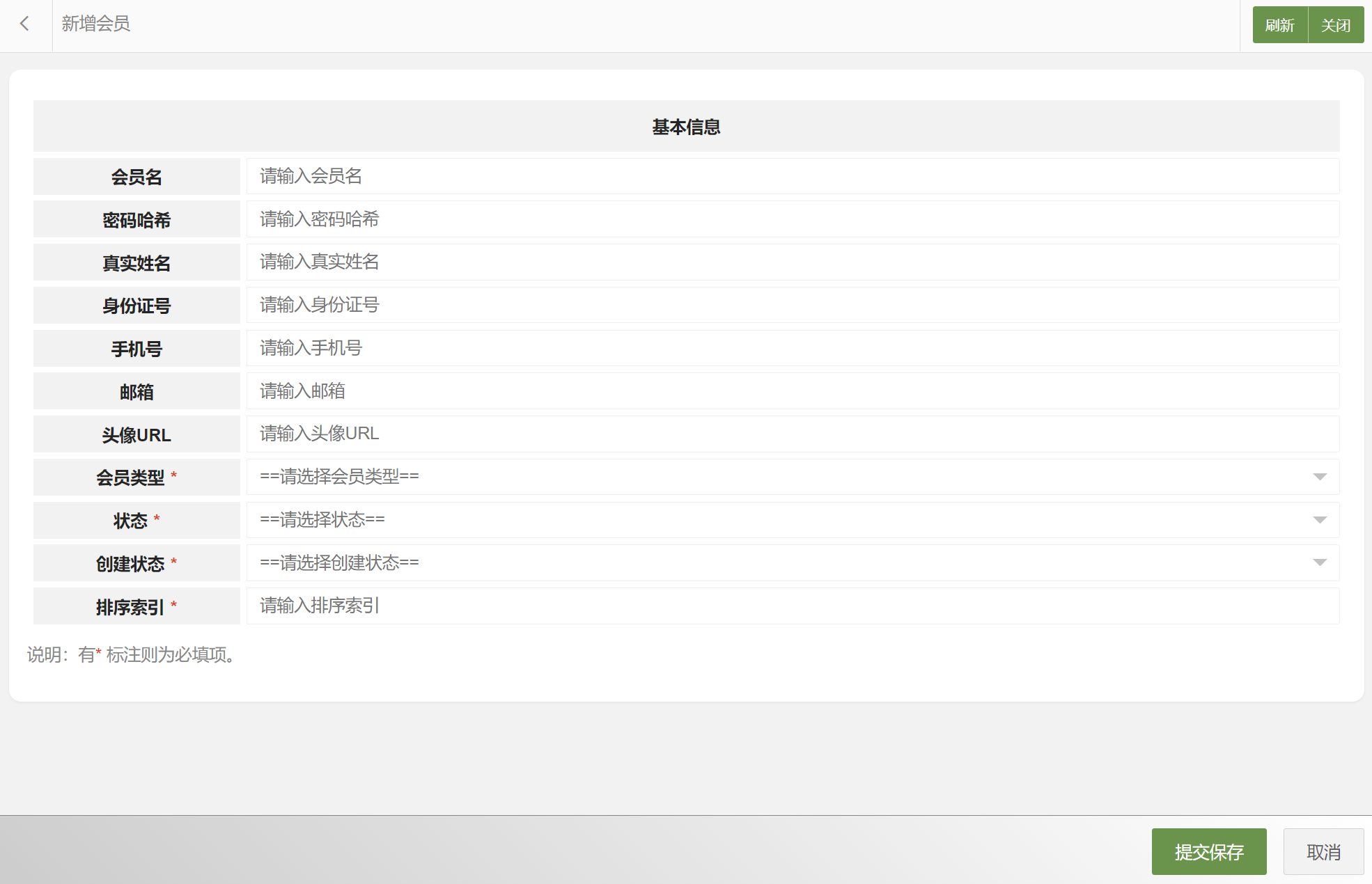 在会员列表中可以选择新增会员、编辑会员、删除会员、搜索会员等。会员属性包括:会员编码、会员名、密码哈希、真实姓名、身份证号、手机号、邮箱、头像URL、会员类型、状态等。新增会员界面如图所示:
