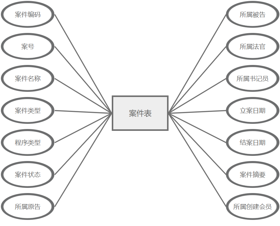 案件管理主要属性包括:案件编码、案号、案件名称、案件类型、程序类型、案件状态、所属原告、所属被告、所属法官、所属书记员、立案日期、结案日期、案件摘要、所属创建会员。