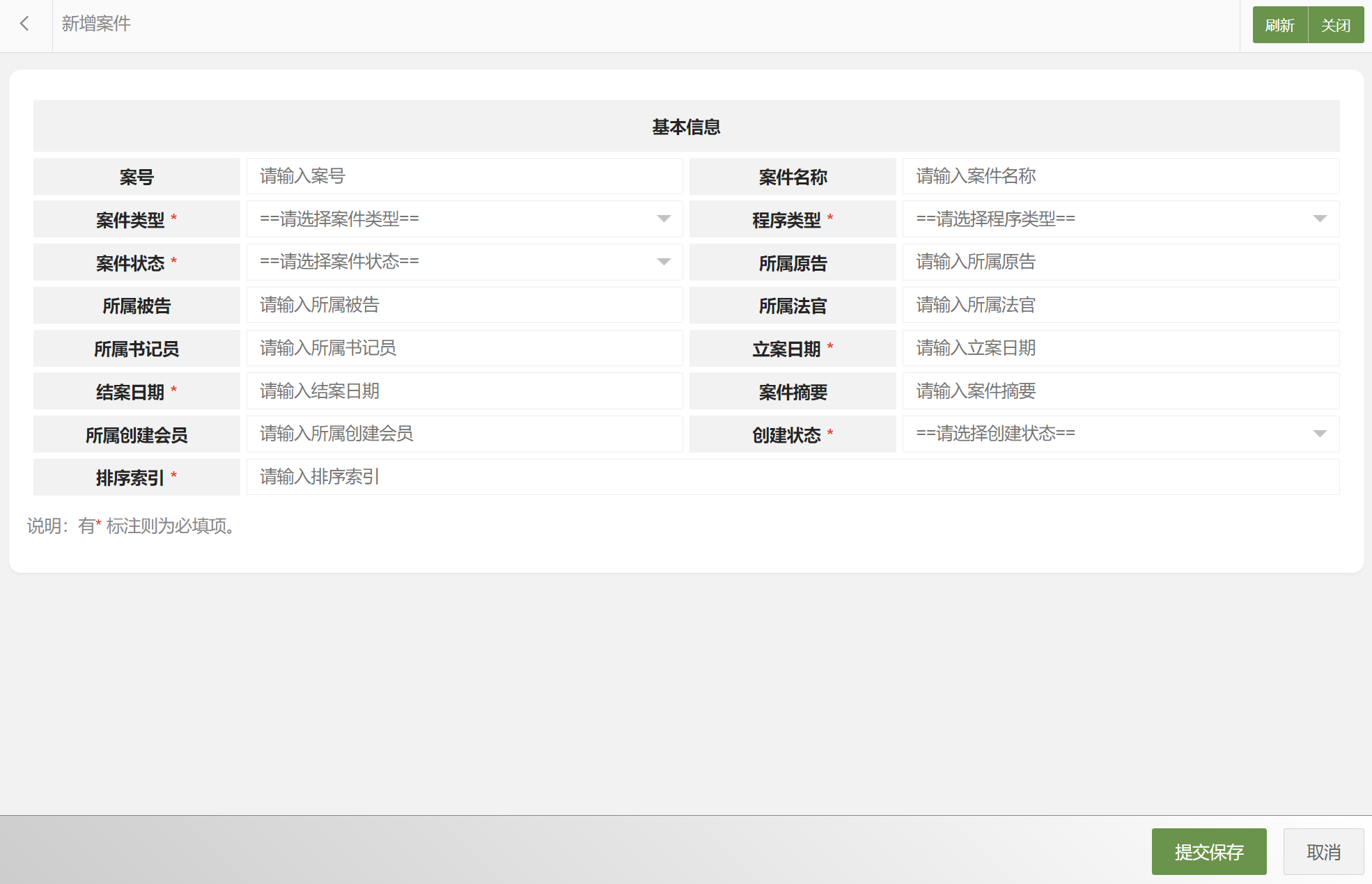 在案件列表中可以选择新增案件、编辑案件、删除案件、搜索案件等。案件属性包括:案件编码、案号、案件名称、案件类型、程序类型、案件状态、所属原告、所属被告、所属法官、所属书记员、立案日期、结案日期、案件摘要、所属创建会员等。新增案件界面如图所示: