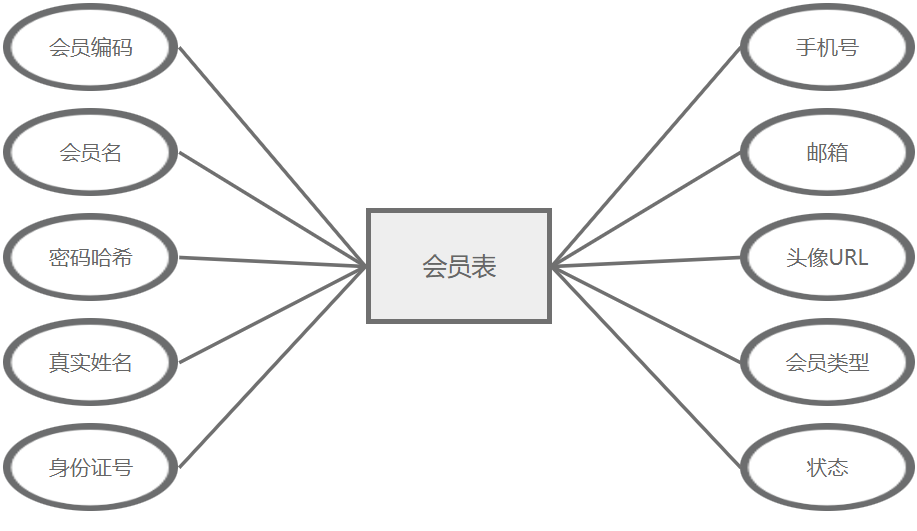 会员管理主要属性包括:会员编码、会员名、密码哈希、真实姓名、身份证号、手机号、邮箱、头像URL、会员类型、状态。