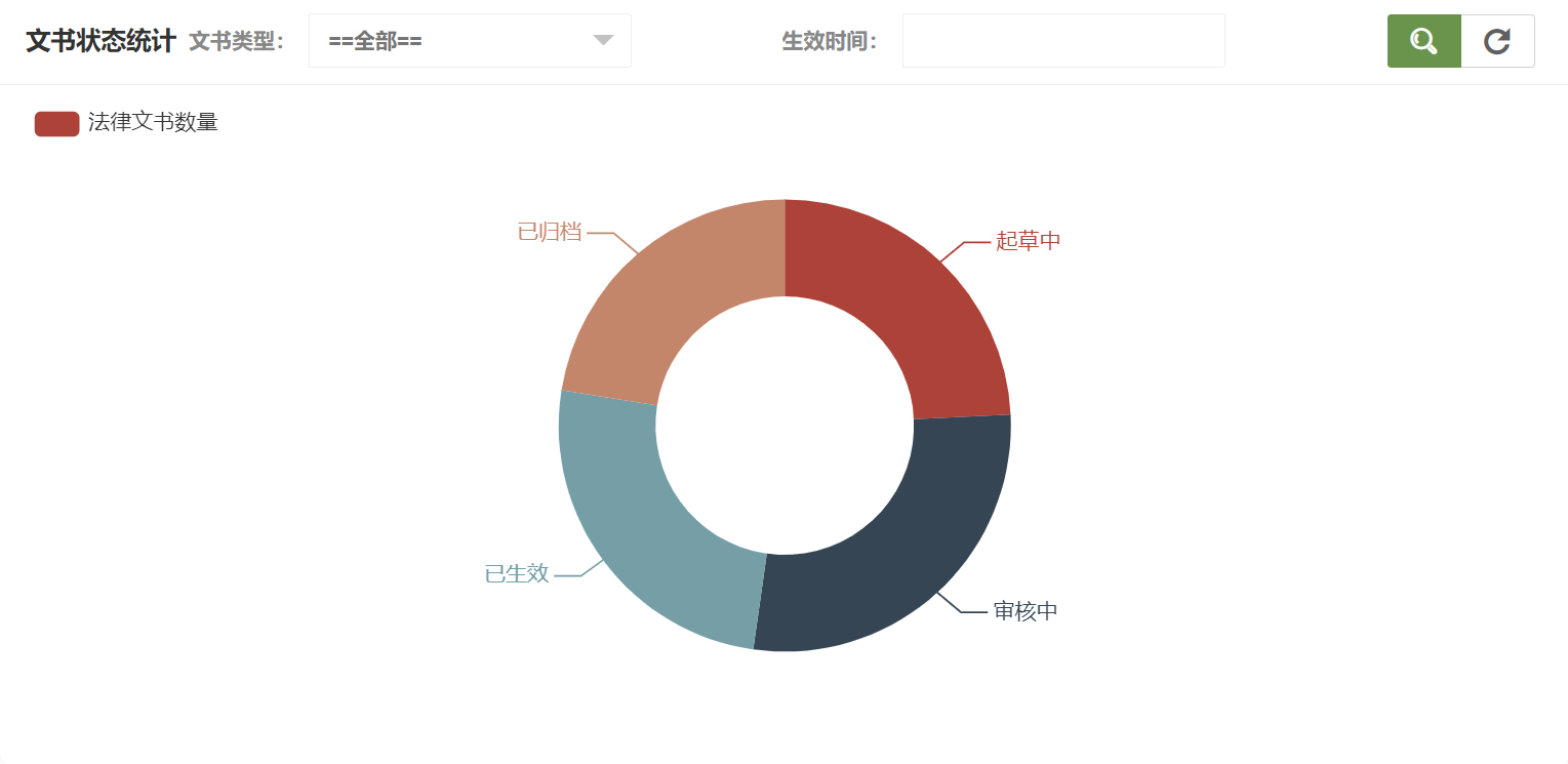 在法律文书统计中可以看到文书类型统计、文书状态统计、生效时间年统计、生效时间月统计、生效时间日统计,文书状态统计如图所示:
