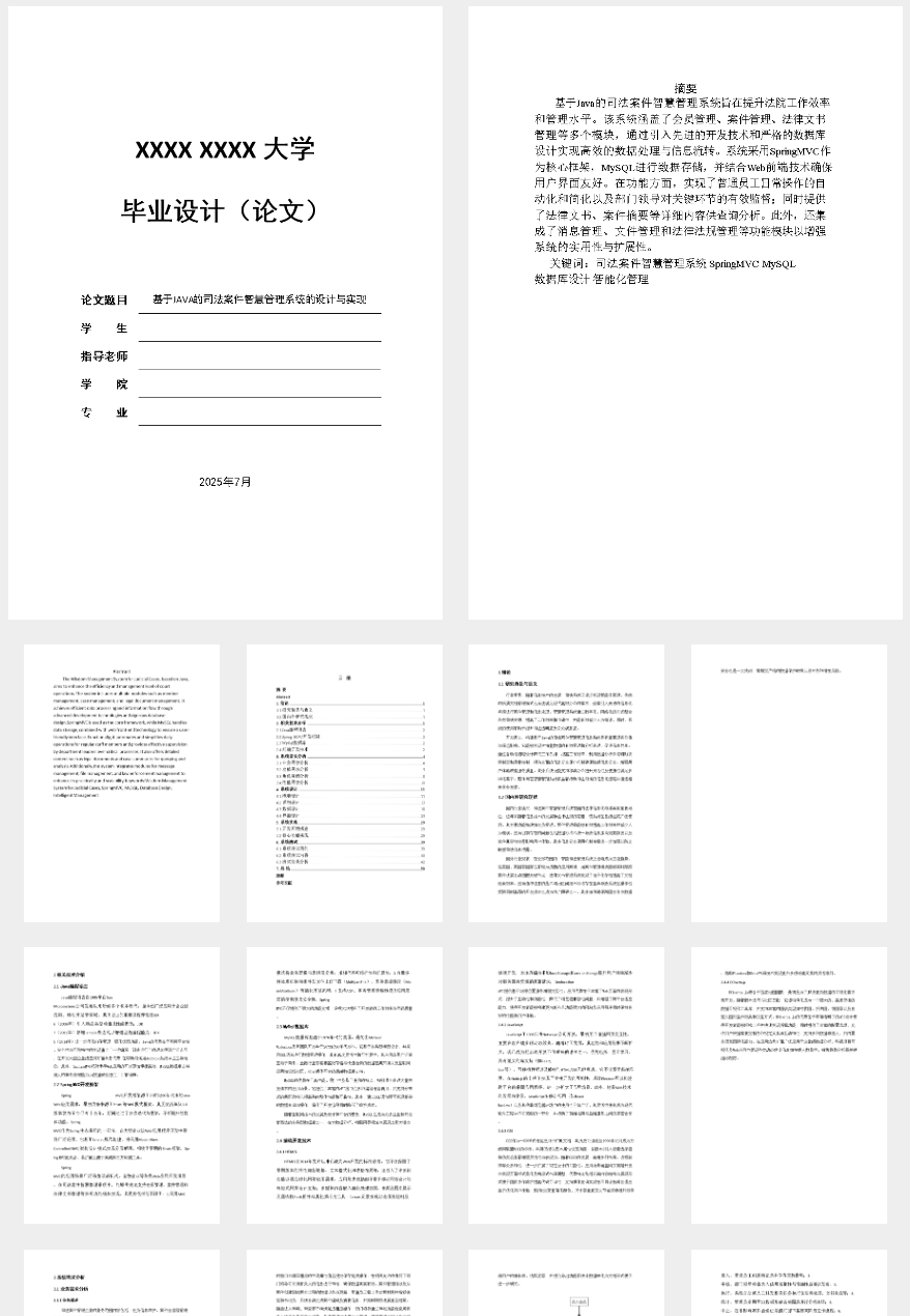 司法案件智慧管理系统基于Java开发,集会员管理、案件处理及法律文书于一体,旨在提升工作效率与准确性。相较于传统选题,此系统更加注重用户体验和操作便捷性,并引入了任务管理和排班管理模块,使得系统的实用性大大增强。通过采用SpringMVC框架结合MySQL数据库技术,实现高效的数据交互与存储;同时,利用Web前端开发及JavaScript增强了系统的界面友好性和数据可视化效果。该系统不仅简化了司法案件处理流程,还提升了信息的透明度和可追溯性。对于零基础开发者而言,其功能模块化设计使得上手难度适中,适合初学者逐步学习掌握现代企业级应用开发技能。