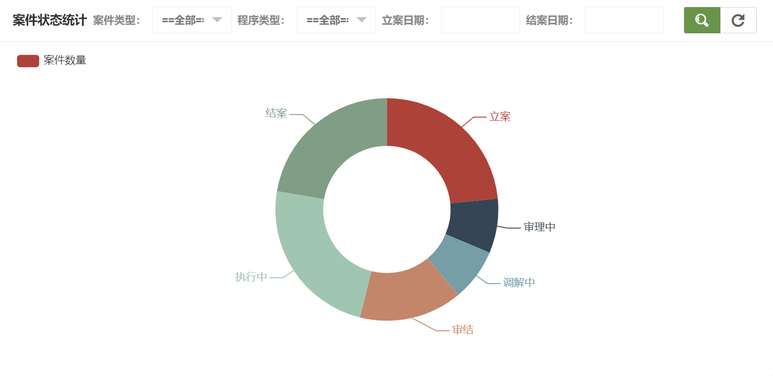 在案件统计中可以看到案件类型统计、程序类型统计、案件状态统计、立案日期年统计、立案日期月统计、立案日期日统计、结案日期年统计、结案日期月统计、结案日期日统计,案件状态统计如图所示: