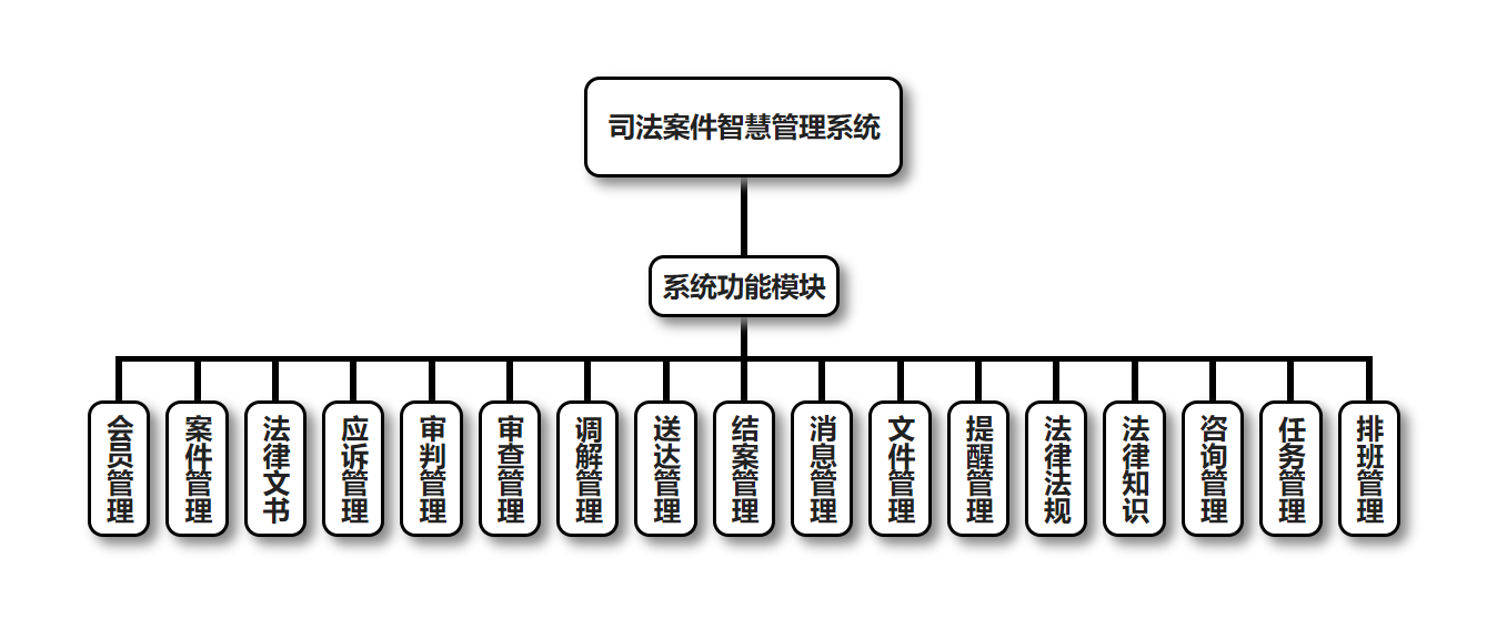 司法案件智慧管理系统的主要功能包括:会员管理、案件管理、法律文书管理、应诉管理、审判管理、审查管理、调解管理、送达管理、结案管理、消息管理、文件管理、提醒管理、法律法规管理、法律知识管理、咨询管理、任务管理、排班管理。