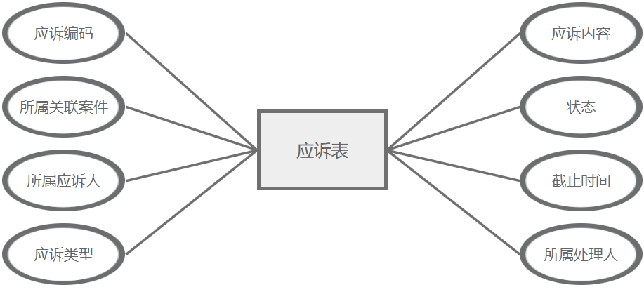 应诉管理主要属性包括:应诉编码、所属关联案件、所属应诉人、应诉类型、应诉内容、状态、截止时间、所属处理人。