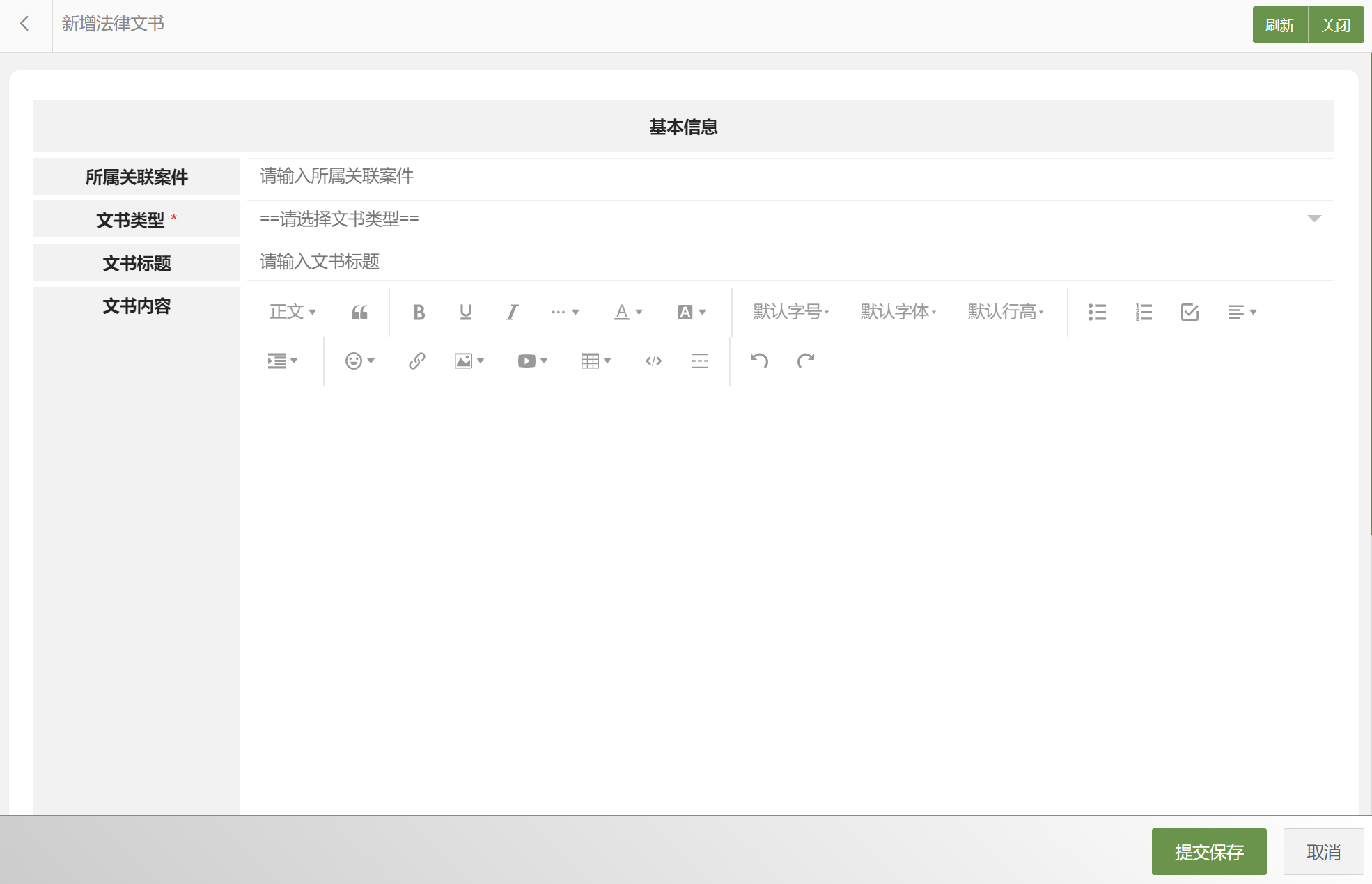 在法律文书列表中可以选择新增法律文书、编辑法律文书、删除法律文书、搜索法律文书等。法律文书属性包括:法律文书编码、所属关联案件、文书类型、文书标题、文书内容、文书状态、所属作者、所属审核人、生效时间、文件存储路径等。新增法律文书界面如图所示: