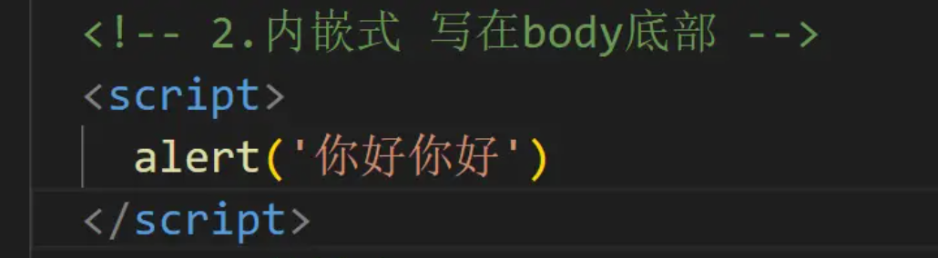 内嵌式:把代码写在script标签对内。(一般推荐写在body底部,代码少的时候可以使用)