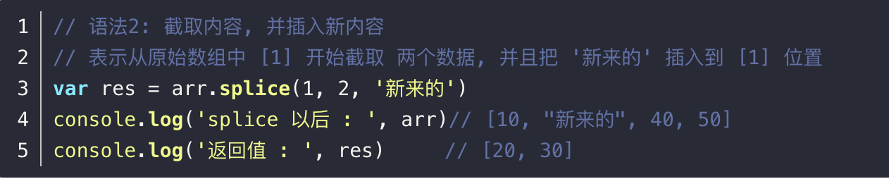 语法2:数组.splice(开始索引,多少个,插入的数据1,插入的数据2...)