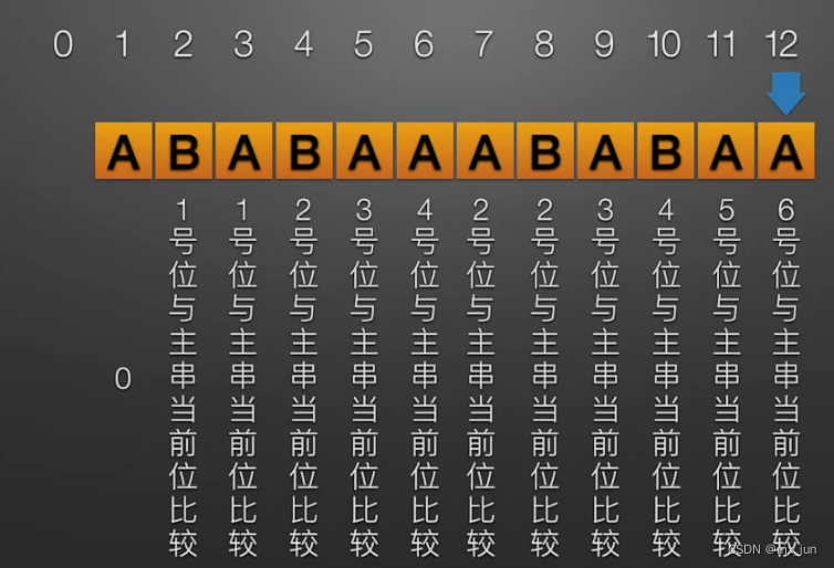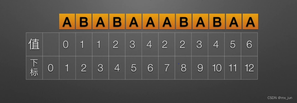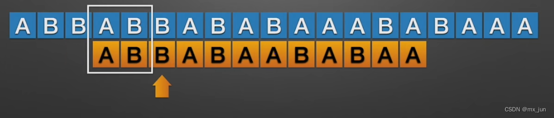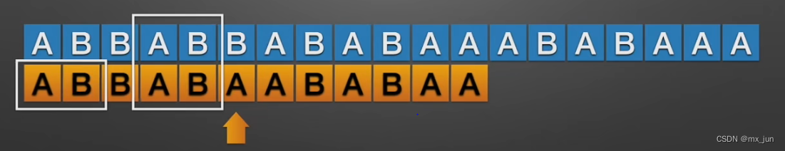 如下图:当不匹配的时候只需要回溯到这个位置:即 最大公共前缀移动到最大公共后缀的位置即可