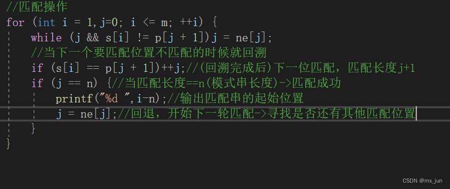 算法核心:比较指针 回溯 : j=ne[j]; //这是字符串匹配最消耗时间的一部分,kmp算法就是将这里最大程度优化,即每次回溯都要回溯到最合适的位置,使得没有多余比较