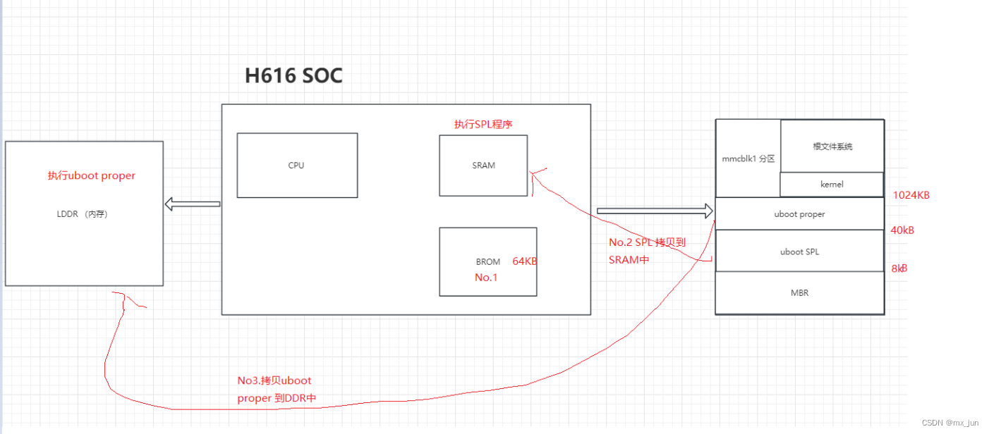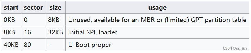 3. brom会从启动设备的特定扇区中,读取第一级引导程序,如spl将其加载到芯片的内部sram中,并跳转到其入口点执行 -- MBR