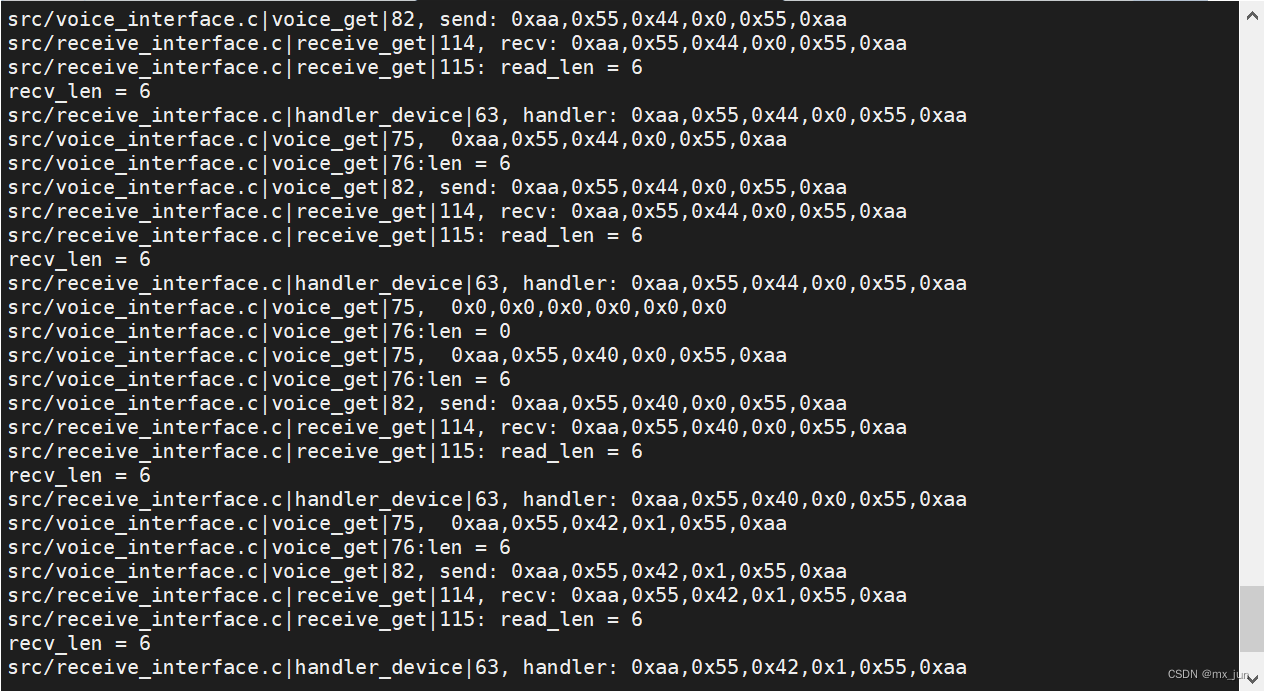 printf("%s|%s|%d, recv: 0x%x,0x%x,0x%x,0x%x,0x%x,0x%x\n",__FILE__,__func__,__LINE__,buffer[0],buffer[1],buffer[2],buffer[3],buffer[4],buffer[5]);