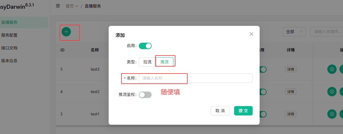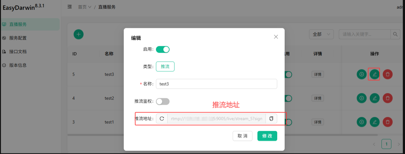 以EasyDarWin8.3.1为例,安装好之后darwin的默认端口是10086访问web页面加一个推流地址: