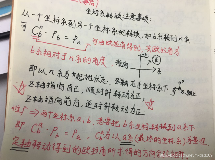 这部分就涉及到坐标系转换和欧拉角与旋转矩阵(方向余弦矩阵)的转换。关于欧拉角,目前不同的地方可能定义不一样,具体可以参考这个博客: