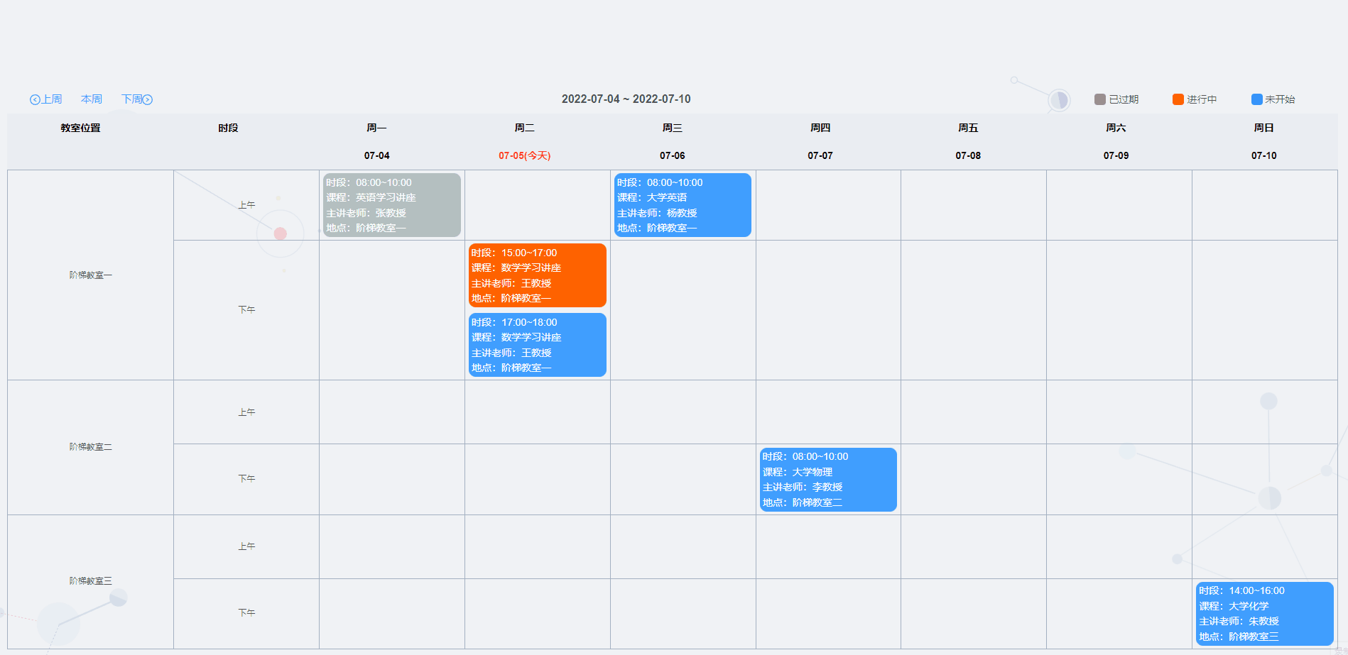 表格的横坐标显示时间,纵坐标显示是对应的教室,根据教室和时间安排生成对应的列表数据