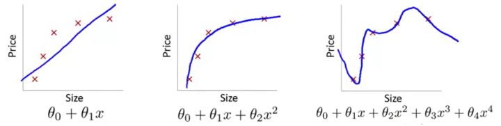 第三张图引入了高次项,就题论题来说,这太复杂了。虽然事实上对于是任意n个点,总能找到n+1次曲线方程将这n个点全部穿过,但是从模型的角度来讲,这显然不是好模型(姑且不说要用一个高次模型去拟合离散点要迭代多少次,学习率要调到多低)。即使它一板一眼地穿过了所有样本点,但谁能保证这种奇形怪状的曲线能穿过下一个随机给出的样本点呢?我们把这种和预测值和样本标签值几乎完全一致的情况叫做过拟合(Overfitting),历史上也称为高方差(High variance)。