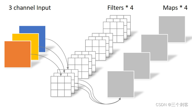 对于一幅128x128像素、3通道彩色输入图像(尺寸128x128x3),经过一个包含4个Filter的3x3卷积层(Filter的个数对应输出通道数3x3x3x4),最终输出4个特征图(Feature Map),