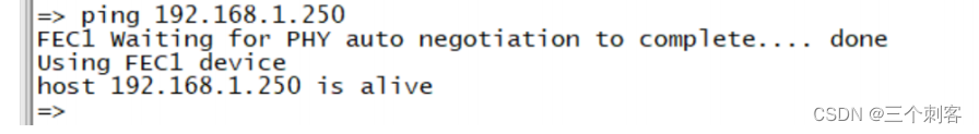 saveenv //保存环境变量设置好环境变量之后就可以在ubot中使用网络,用网线将ENET2与电脑或者路由器连接起来,保证开发板和电脑在同一个网段内,通过Ping命令测试一下网络连接