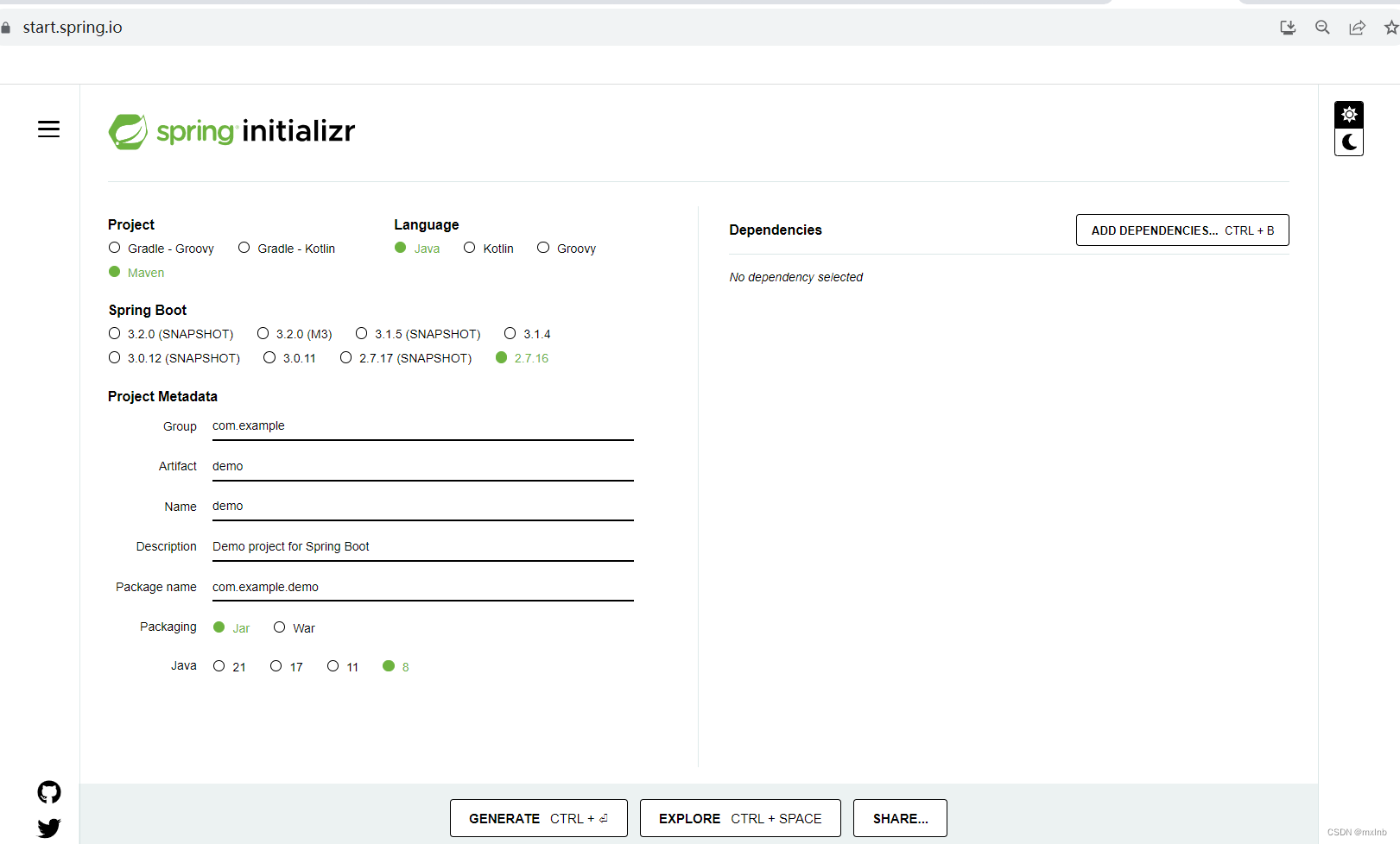 2.从spring官网选择相应的SpringBoot版本配置信息,打包后在本地IDE导入即可