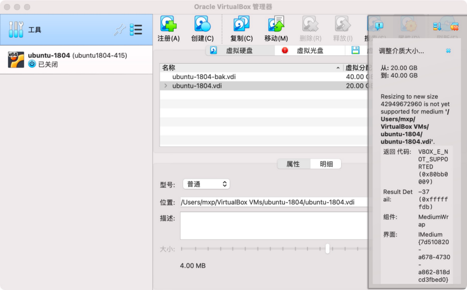 最近在虚拟机里编译一个大型项目时,突然收到磁盘空间不足的提示。打开 VirtualBox 管理器一看,当初分配的 20GB 空间果然快满了。想着直接在图形界面调整磁盘大小,结果遇到了错误提示:返回VBOX__E__NOT_SUPPORTED
